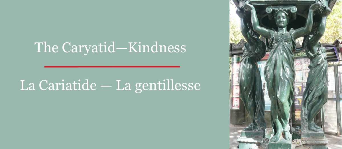 Chaque fontaine Wallace est ornée de quatre cariatides soutenant le dôme, et chacune de ces figures féminines gréco-romaines représente une vertu humaine différente. Richard Wallace espérait que ceux qui utilisaient les fontaines seraient inspirés à incarner ces vertus dans leur propre vie. Une cariatide représente la gentillesse. Cette figure est représentée avec le genou gauche plié vers l'avant et sa toge tombant gracieusement jusqu'à ses