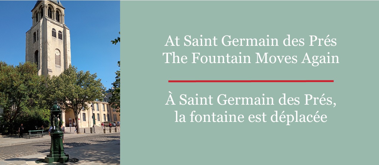 Société d'Encouragement pour l'Industrie Nationale at 4 Place Saint Germain des Prés. The fountain was often blocked from view when café terrace extensions filled the square. The square underwent renovation in 2024, and the fountain was moved again. This time the newly restored fountain was placed in an open area at the edge of the square near rue Bonaparte. It is not unusual for Wallace fountains to be moved to accommodate the development of the city. What is important is that they are put back on the streets at new locations where they can continue to provide drinking water to residents and visitors.